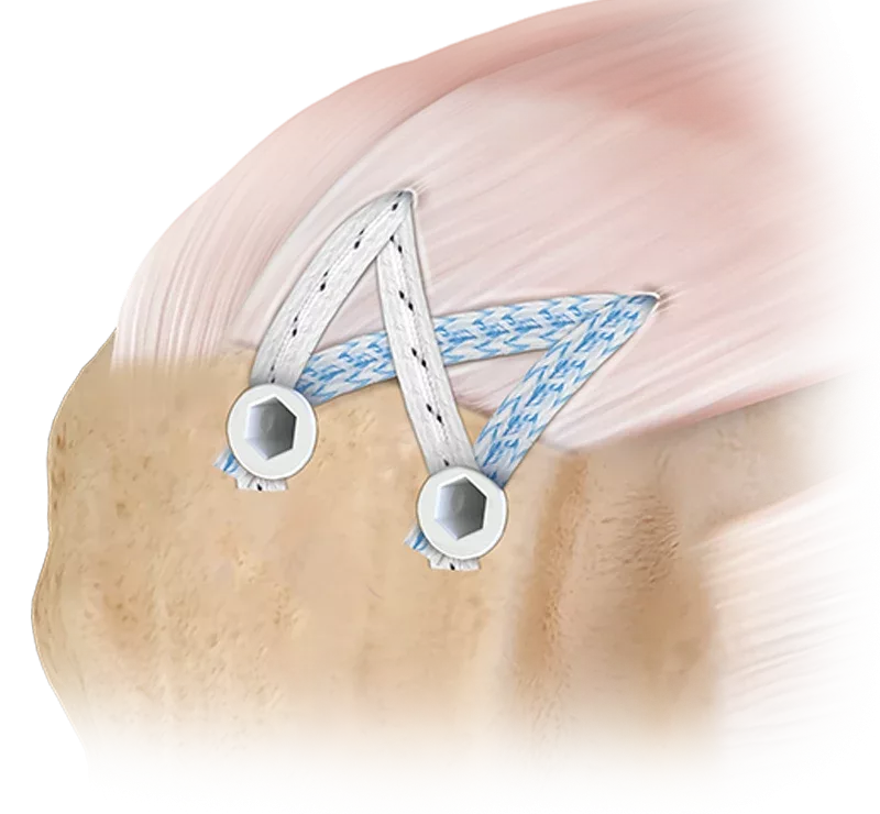 Ensuite, le chirurgien prépare la zone d’insertion tendineuse sur le trochiter (tubercule majeur de l’humérus) en la “décortiquant” afin de favoriser la cicatrisation. Des ancres, petites vis munies de fils non résorbables, sont insérées dans l’os. Les fils sont ensuite passés à travers le tendon rompu à l’aide de pinces ou d’aiguilles spéciales.